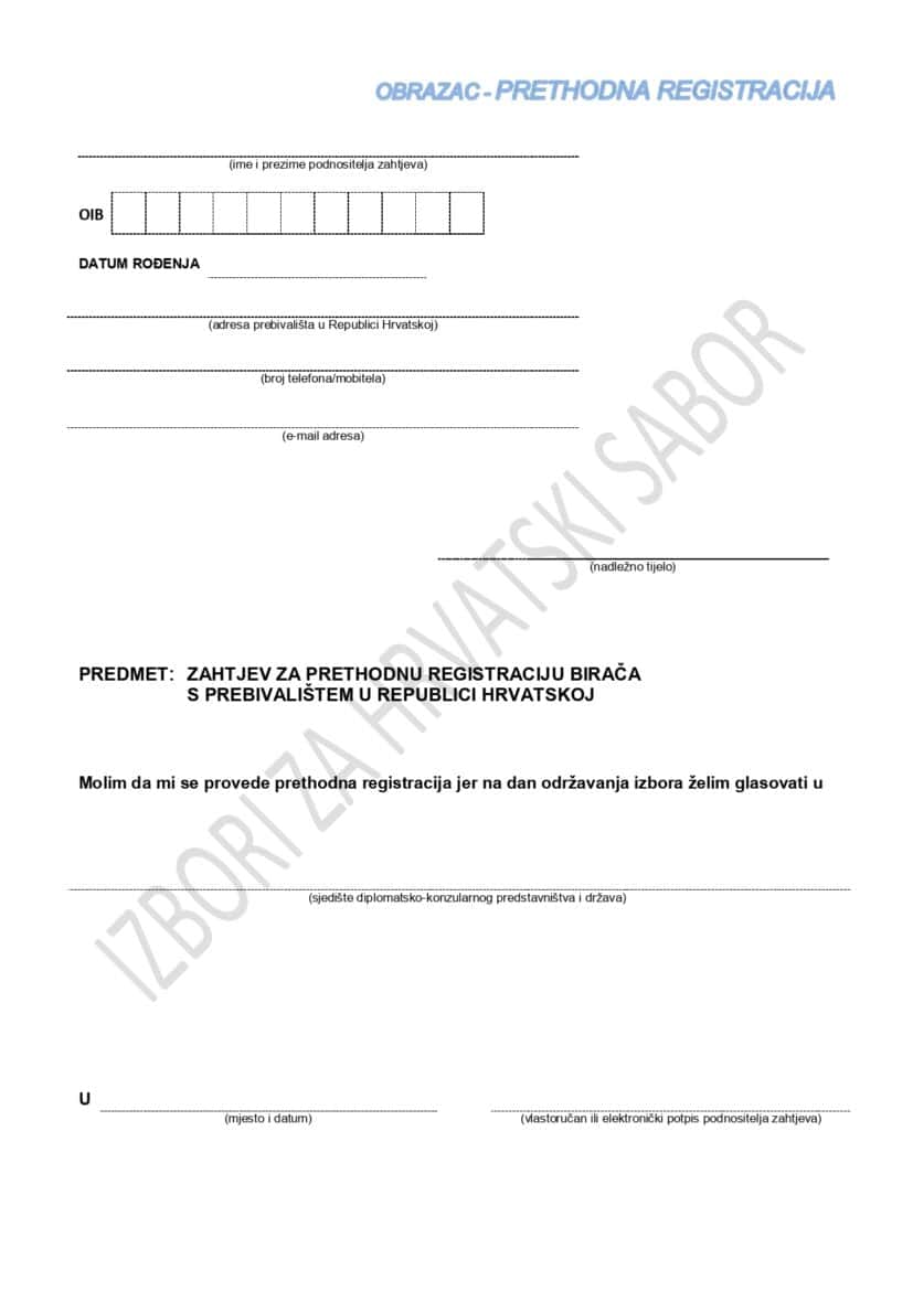 Zahtjev za prethodnu registraciju birači mogu podnijeti nadležnoj diplomatskoj misiji ili konzularnom uredu Republike Hrvatske u inozemstvu ili nadležnom upravnom tijelu u županiji odnosno Gradu Zagrebu koje vodi registar birača.