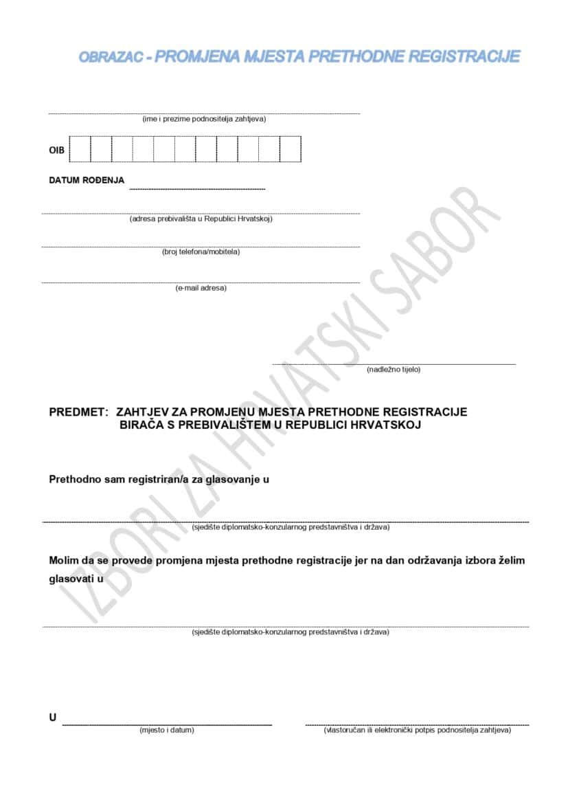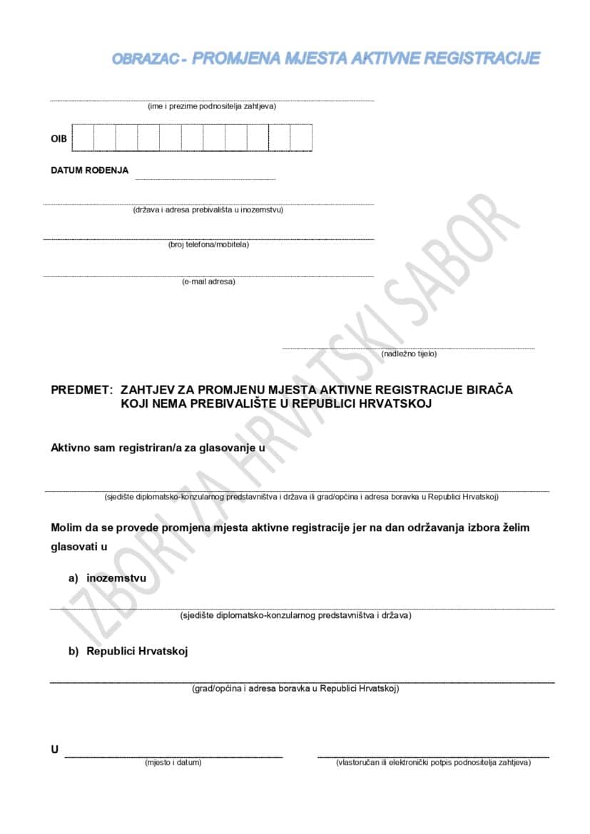 Birači koji će se na dan održavanja izbora nalaziti na području druge diplomatske misije ili konzularnog ureda u inozemstvu ili u Republici Hrvatskoj ili imaju prijavljeno prebivalište na adresi različitoj od navedene u osobnoj iskaznici s inozemnom adresom, moraju podnijeti ZAHTJEV ZA PROMJENU MJESTA AKTIVNE REGISTRACIJE.
