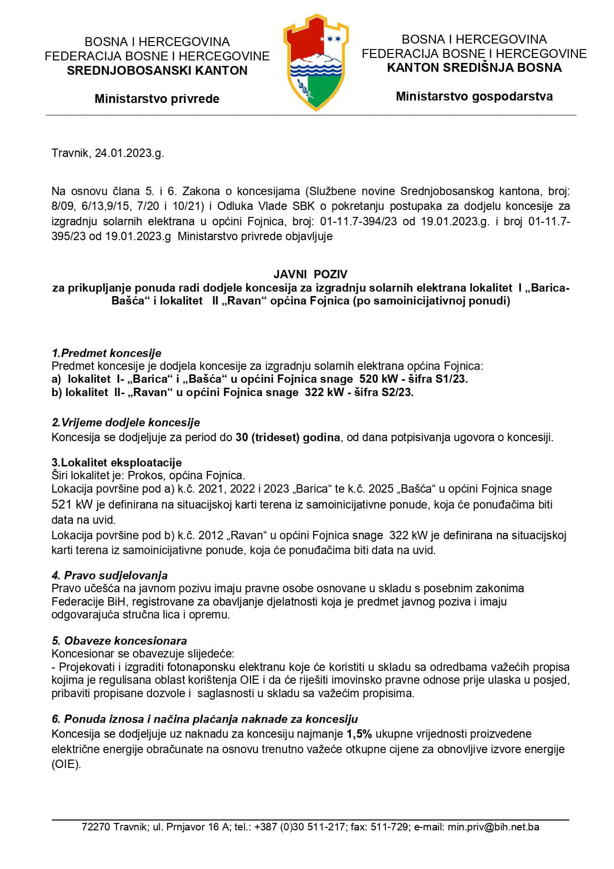 Na osnovu člana 5. i 6. Zakona o koncesijama (Službene novine Srednjobosanskog kantona, broj: 8/09, 6/13,9/15, 7/20 i 10/21) i Odluka Vlade SBK o pokretanju postupaka za dodjelu koncesije za izgradnju solarnih elektrana u općini Fojnica, broj: 01-11.7-394/23 od 19.01.2023.g. i broj 01-11.7-395/23 od 19.01.2023.g Ministarstvo privrede objavljuje slijedeći Javni Poziv: